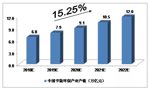 近年來,國家利好政策不斷出臺,明確提出要加快發(fā)展先進(jìn)環(huán)保產(chǎn)業(yè),積極推廣應(yīng)用先進(jìn)環(huán)保產(chǎn)品,促進(jìn)環(huán)境服務(wù)業(yè)發(fā)展。在此背景下,業(yè)內(nèi)預(yù)計(jì),2018年我國節(jié)能環(huán)保產(chǎn)業(yè)產(chǎn)值將達(dá)到6.8萬億元,未來五年(2018-2022)年均復(fù)合增長率約為15.25%,2022年將達(dá)到12.0萬億元。