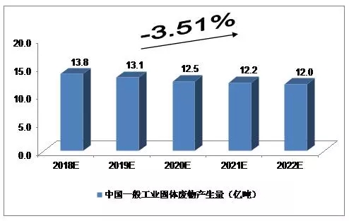 2015年,246個(gè)大、中城市一般工業(yè)固體廢物產(chǎn)生量達(dá)19.1億噸;2016年,214個(gè)大、中城市一般工業(yè)固體廢物產(chǎn)生量達(dá)14.8億噸。我們預(yù)計(jì),2018年中國一般工業(yè)固體廢物產(chǎn)生量將達(dá)到13.8億噸,未來五年(2018-2022)行業(yè)年均復(fù)合增長率約為-3.51%,2022年達(dá)到12.0億噸。
