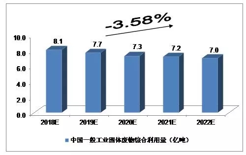 2015年,246個(gè)大、中城市一般工業(yè)固體廢物綜合利用量達(dá)11.8億噸;2016年,214個(gè)大、中城市一般工業(yè)固體廢物綜合利用量達(dá)8.6億噸。我們預(yù)計(jì),2018年中國一般工業(yè)固體廢物綜合利用量將達(dá)到8.1億噸,未來五年(2018-2022)行業(yè)年均復(fù)合增長率約為-3.58%,2022年達(dá)到7.0億噸。