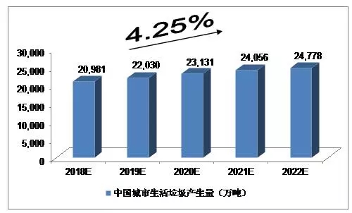 2015年,246個(gè)大、中城市生活垃圾產(chǎn)生量為18,564.0萬噸;2016年,我國214個(gè)大、中城市生活垃圾產(chǎn)生量18,850.5萬噸。我們預(yù)計(jì),2018年中國城市生活垃圾產(chǎn)生量將達(dá)到20,981萬噸,未來五年(2018-2022)行業(yè)年均復(fù)合增長率約為4.25%,2022年達(dá)到24,778萬噸。