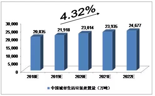 2015年,246個(gè)大、中城市生活垃圾處置量為18,069.5萬噸;2016年,我國214個(gè)大、中城市生活垃圾處置量為18,684.4萬噸。我們預(yù)計(jì),2018年中國城市生活垃圾處置量將達(dá)到20,835萬噸,未來五年(2018-2022)行業(yè)年均復(fù)合增長率約為4.32%,2022年達(dá)到24,677萬噸。