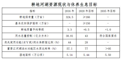 到2020年,耕地?cái)?shù)量穩(wěn)定、質(zhì)量提高,河湖生態(tài)空間有效恢復(fù),濕地面積增加,耕地河湖生態(tài)功能有效改善,資源有效保護(hù)和高效利用的政策與技術(shù)支撐體系基本建立。到2035年,耕地河湖資源利用與養(yǎng)護(hù)全面步入良性循環(huán),資源休養(yǎng)生息制度體系更加完善,形成資源利用高效、生態(tài)系統(tǒng)穩(wěn)定、農(nóng)業(yè)可持續(xù)發(fā)展、水生態(tài)環(huán)境優(yōu)良的新格局,實(shí)現(xiàn)人與自然和諧共生。