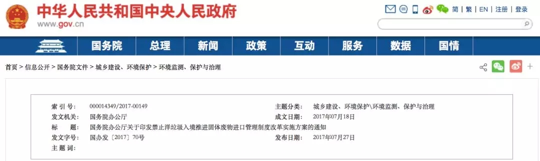 去年7月18日,國務(wù)院辦公廳發(fā)布《關(guān)于印發(fā)禁止洋垃圾入境 推進(jìn)固體廢物進(jìn)口管理制度改革實(shí)施方案的通知》,通知稱: