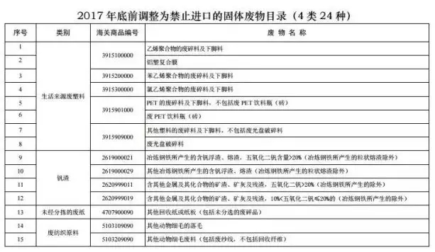 決定禁止進(jìn)口的“洋垃圾”有4大類共24種,分別是來自生活源的廢塑料(8種)、未經(jīng)分揀的廢紙(1種)、廢紡織品原料(11種)和釩渣(4種)。這一進(jìn)口禁令已經(jīng)從去年12月31日起執(zhí)行。