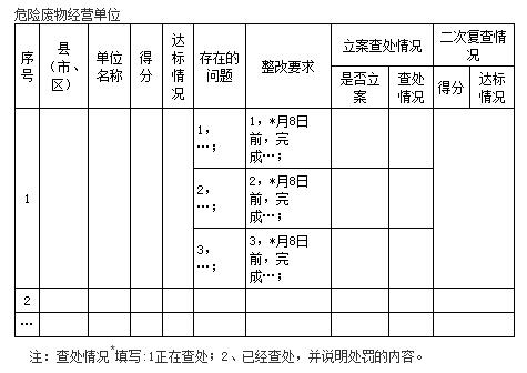 (一)縣、市、區(qū)自查考核。各縣、市、區(qū)環(huán)保局由固體廢物管理、環(huán)境監(jiān)察、環(huán)境監(jiān)測(cè)等相關(guān)業(yè)務(wù)部門組成考核組,對(duì)產(chǎn)廢單位和經(jīng)營單位進(jìn)行自查考核。自查考核應(yīng)嚴(yán)格執(zhí)行環(huán)境保護(hù)部《危險(xiǎn)廢物規(guī)范化管理指標(biāo)體系》(環(huán)辦〔2015〕99號(hào))規(guī)定的考核內(nèi)容和評(píng)分標(biāo)準(zhǔn),不得隨意放寬標(biāo)準(zhǔn)。考核時(shí)填寫《被考核單位現(xiàn)場(chǎng)檢查基本情況記錄表》(見附件3)。縣級(jí)環(huán)保部門自查考核和復(fù)查工作于5月31日前完成,考核結(jié)果及工作報(bào)告(工作報(bào)告按附件4格式,附考核結(jié)果匯總表)于6月10日前報(bào)市局