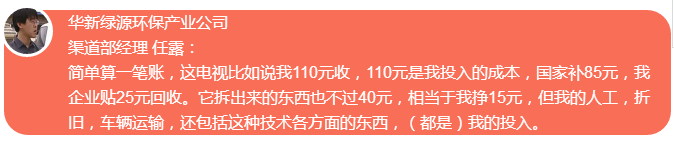回收廢棄家電的成本,加上承擔(dān)無害化環(huán)保處理電子垃圾的責(zé)任,正規(guī)拆解企業(yè)平均毛利率不到10%,甚至在回收渠道和價格上,也拼不過類似廣東貴嶼這樣發(fā)展了二十多年的產(chǎn)業(yè)鏈。而同類難題,在各個再生資源的生產(chǎn)鏈條中,也都或多或少存在。顯然,拒絕洋垃圾的同時,加大力度打擊國內(nèi)環(huán)境違法企業(yè),扶持技術(shù)含量高的再生資源企業(yè),是政府必須著重考慮的問題。