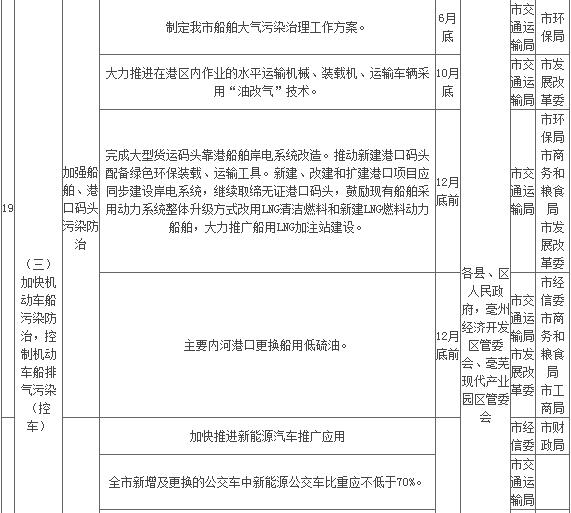 6. 加強(qiáng)船舶、港口碼頭污染防治。2018年6月底前,制定我市船舶大氣污染治理工作方案;2018年10月底前,大力推進(jìn)在港區(qū)內(nèi)作業(yè)的水平運(yùn)輸機(jī)械、裝載機(jī)、運(yùn)輸車輛采用“油改氣”技術(shù);2018年底前,完成大型貨運(yùn)碼頭靠港船舶岸電系統(tǒng)改造。推動(dòng)新建港口碼頭配備綠色環(huán)保裝載、運(yùn)輸工具。新建、改建和擴(kuò)建港口項(xiàng)目應(yīng)同步建設(shè)岸電系統(tǒng),繼續(xù)取締無證港口碼頭,鼓勵(lì)現(xiàn)有船舶采用動(dòng)力系統(tǒng)整體升級方式改用LNG清潔燃料和新建LNG燃料動(dòng)力船舶,大力推廣船用LNG加注站建設(shè)。2018年底前,主要內(nèi)河港口更換船用低硫油(硫含量不高于0.5%m/m的燃油)。(責(zé)任單位:各縣、區(qū)人民政府,亳州經(jīng)濟(jì)開發(fā)區(qū)管委會(huì)、亳蕪現(xiàn)代產(chǎn)業(yè)園區(qū)管委會(huì);牽頭部門:市交通運(yùn)輸局,配合部門:市環(huán)保局、市商務(wù)和糧食局、市發(fā)展改革委)