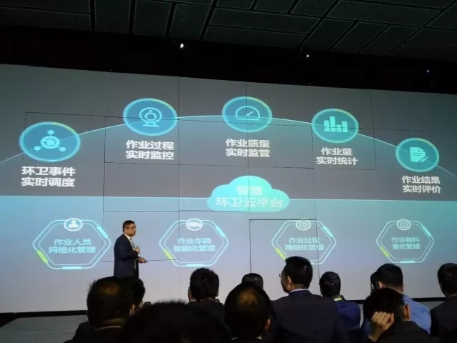 圖注:中聯(lián)環(huán)境執(zhí)行總裁陳培亮講解中聯(lián)環(huán)境智慧環(huán)衛(wèi)云平臺