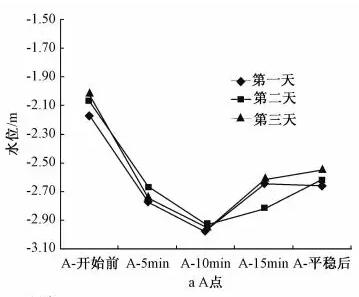 試驗(yàn)發(fā)現(xiàn),A、B、C、D2、E1等5個(gè)點(diǎn)的水位,會(huì)隨F調(diào)蓄池進(jìn)水至蓄滿(mǎn)而呈U型狀變化,以A、B、C為例(見(jiàn)圖2),基本都在10~15 min時(shí)水位變化最為明顯。但位于遠(yuǎn)端的D、E、D1等3個(gè)點(diǎn)幾乎未發(fā)生變化。由此可以初步判斷,F(xiàn)調(diào)蓄池對(duì)進(jìn)水總管的拉動(dòng),至C點(diǎn)結(jié)束,總長(zhǎng)約1 200 m;調(diào)蓄池的運(yùn)行,僅對(duì)鄰近的管網(wǎng)起到了收水效果。