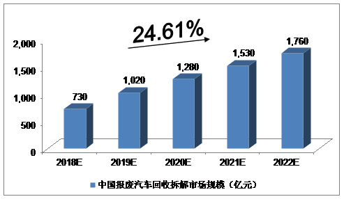綜合以上因素,我們預(yù)計(jì),2018年中國(guó)報(bào)廢汽車回收拆解市場(chǎng)規(guī)模將達(dá)到730億元,未來(lái)五年(2018-2022)年均復(fù)合增長(zhǎng)率約為24.61%,2022年中國(guó)報(bào)廢汽車回收拆解市場(chǎng)規(guī)模將達(dá)到1760億元。