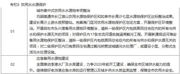 深入推進(jìn)飲用水水源地環(huán)境保護(hù)執(zhí)法專項(xiàng)行動(dòng),加大集中式飲用水水源地保護(hù)區(qū)內(nèi)違章建設(shè)項(xiàng)目的清拆力度,依法查處保護(hù)區(qū)內(nèi)的違法行為。鞏固狼山飲用水水源地環(huán)境問(wèn)題整治成果,逐步搬遷飲用水源地二級(jí)保護(hù)區(qū)內(nèi)集裝箱及散貨專業(yè)碼頭。排查和依法取締飲用水水源保護(hù)區(qū)內(nèi)的排污口以及影響水源地保護(hù)的碼頭,實(shí)施水源地及周邊區(qū)域環(huán)境綜合整治。定期調(diào)查評(píng)估集中式地下水型飲用水水源補(bǔ)給區(qū)環(huán)境狀況。依法劃定飲用水水源地保護(hù)區(qū),定期開(kāi)展縣級(jí)以上集中式飲用水水源地環(huán)境狀況調(diào)查評(píng)估,按照“水量保證、水質(zhì)達(dá)標(biāo)、應(yīng)急保障”的要求,加強(qiáng)飲用水水源地及應(yīng)急備用水源達(dá)標(biāo)建設(shè)。對(duì)未達(dá)到Ⅲ類水質(zhì)要求的飲用水水源要制定并實(shí)施水質(zhì)達(dá)標(biāo)方案。加強(qiáng)飲用水水源風(fēng)險(xiǎn)防控體系建設(shè),進(jìn)一步優(yōu)化沿江取水口和排污口布局。強(qiáng)化對(duì)水源周邊可能影響水源安全的制藥、化工、造紙、制革、印染、電鍍、農(nóng)藥等重點(diǎn)行業(yè)企業(yè)的執(zhí)法監(jiān)管。推進(jìn)水廠加速提標(biāo)擴(kuò)能,組織實(shí)施狼山水廠深度處理改造,實(shí)現(xiàn)供好水向供優(yōu)質(zhì)水轉(zhuǎn)變。到2020年,全市基本實(shí)現(xiàn)“雙源供水”。