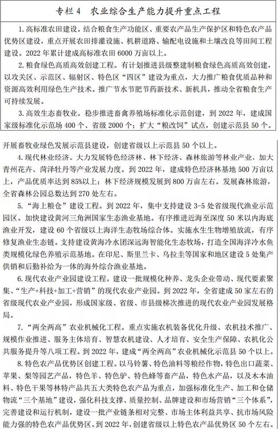 (一)實施藏糧于地、藏糧于技戰(zhàn)略。嚴守耕地紅線,強化用途管制,加強永久基本農(nóng)田質(zhì)量建設,建立健全耕地保護補償和激勵機制,構建數(shù)量、質(zhì)量、生態(tài)“三位一體”的耕地保護體系,到2020年,全省耕地保有量不低于11288萬畝。把保障糧食安全作為農(nóng)業(yè)現(xiàn)代化的首要任務,劃定糧食生產(chǎn)功能區(qū)和重要農(nóng)產(chǎn)品生產(chǎn)保護區(qū),加強特色農(nóng)產(chǎn)品優(yōu)勢區(qū)創(chuàng)建工作,加快建設高標準農(nóng)田,打造保障國家和區(qū)域糧食安全、重要農(nóng)產(chǎn)品有效供給的核心區(qū)。開展糧食綠色高質(zhì)高效創(chuàng)建,強化技術和模式攻關,選育推廣高產(chǎn)、優(yōu)質(zhì)、多抗糧食新品種,推進糧食綠色生產(chǎn)。實施耕地質(zhì)量提升計劃,提高土壤生態(tài)水平,培肥地力,實現(xiàn)耕地資源永續(xù)利用。到2020年全省建成高標準農(nóng)田5982萬畝,糧食生產(chǎn)能力達到1000億斤。