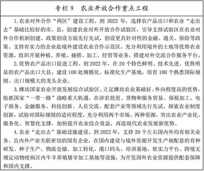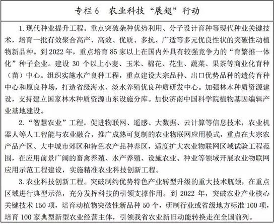 (一)提升農(nóng)業(yè)科技創(chuàng)新能力。積極爭取國家級涉農(nóng)科研機構在山東布局分支機構,加快濰坊北京大學現(xiàn)代農(nóng)業(yè)研究院建設。強化全省農(nóng)業(yè)高校、科研院所、農(nóng)產(chǎn)品加工大企業(yè)研發(fā)中心等各類農(nóng)業(yè)科技資源整合和集成,搭建農(nóng)科教創(chuàng)新平臺,建設一批省級以上農(nóng)業(yè)重點實驗室和技術創(chuàng)新中心,造就一批具有較強國際競爭力的創(chuàng)新型領軍企業(yè),全面提升農(nóng)業(yè)科技創(chuàng)新能力和核心競爭力。多管齊下引進對我省現(xiàn)代農(nóng)業(yè)產(chǎn)業(yè)發(fā)展有重大影響的創(chuàng)新科研團隊和海內(nèi)外高層次農(nóng)業(yè)科技人才。通過政策扶持、項目匹配、資金資助等方式,深入實施農(nóng)業(yè)科研杰出人才計劃和杰出青年農(nóng)業(yè)科學家項目,培養(yǎng)一批科技領軍人才和高水平創(chuàng)新創(chuàng)業(yè)團隊。完善首席專家、農(nóng)業(yè)技術推廣人員和新型經(jīng)營主體的聯(lián)動機制,探索建立“創(chuàng)新團隊+基層農(nóng)技推廣體系+新型職業(yè)農(nóng)民培育”的新型農(nóng)業(yè)科技服務模式。扎實推進農(nóng)業(yè)科技園區(qū)體系建設,提升綜合創(chuàng)新能力和服務水平。將黃河三角洲農(nóng)業(yè)高新技術產(chǎn)業(yè)示范區(qū)建成具有全國影響力的農(nóng)業(yè)科技園區(qū),在部分領域形成世界領先的高科技產(chǎn)業(yè)。到2022年,力爭全省農(nóng)業(yè)高新技術企業(yè)達到1000家左右,培育一批產(chǎn)業(yè)規(guī)模超10億元的優(yōu)勢產(chǎn)業(yè),形成年銷售收入超100億元的特色優(yōu)勢產(chǎn)業(yè)集群,農(nóng)業(yè)科技進步貢獻率達到66%左右。