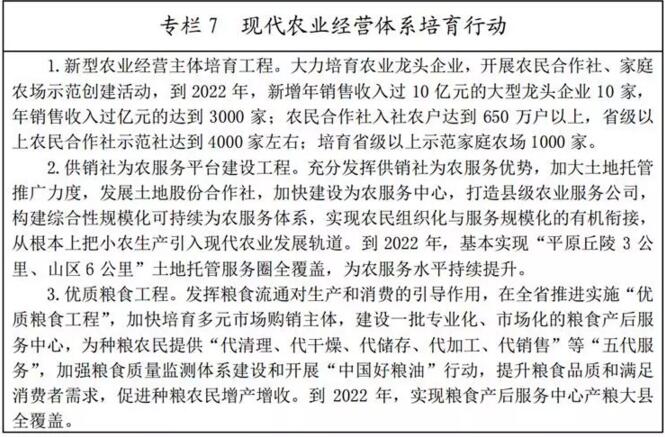 (五)打造農(nóng)業(yè)“新六產(chǎn)”平臺載體。深入實施農(nóng)村產(chǎn)業(yè)融合發(fā)展“百縣千鄉(xiāng)萬村”試點示范工程,開展農(nóng)業(yè)“新六產(chǎn)”示范縣、示范主體創(chuàng)建,帶動形成一批百億級、千億級農(nóng)村產(chǎn)業(yè)融合發(fā)展集群,創(chuàng)建一批國家級和省級農(nóng)村產(chǎn)業(yè)融合發(fā)展示范園、先導區(qū)。促進產(chǎn)城融合發(fā)展,引導二三產(chǎn)業(yè)向縣城、重點鄉(xiāng)鎮(zhèn)及產(chǎn)業(yè)園區(qū)等集中,打造一批農(nóng)村產(chǎn)業(yè)融合領軍企業(yè),培育一批農(nóng)業(yè)特色小鎮(zhèn)和田園綜合體。堅持產(chǎn)業(yè)園區(qū)、科技園區(qū)、創(chuàng)業(yè)園區(qū)“三園同建”,以園區(qū)化引領發(fā)展現(xiàn)代農(nóng)業(yè),融合發(fā)展關聯(lián)產(chǎn)業(yè),著力打造現(xiàn)代農(nóng)業(yè)綜合發(fā)展平臺。到2020年,農(nóng)業(yè)“新六產(chǎn)”對農(nóng)民增收貢獻率顯著提高,建設農(nóng)業(yè)“新六產(chǎn)”示范縣50個、示范主體600家。2022年農(nóng)業(yè)“新六產(chǎn)”發(fā)展布局基本成熟。