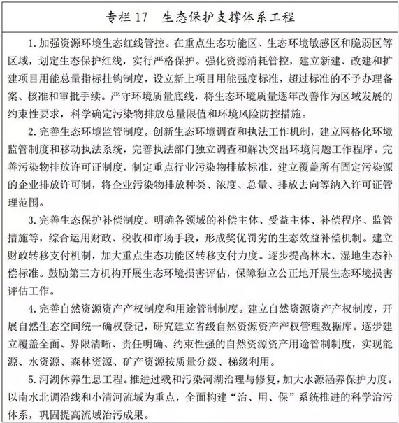 (一)健全生態(tài)保護補償機制。完善以政府購買服務為主的公益林管護機制,建立重點生態(tài)公益林補償標準動態(tài)調(diào)整機制和以森林植被碳儲量為切入點的市場化生態(tài)保護補償機制,繼續(xù)實施國家、省級重點公益林營造、撫育、保護和管理的生態(tài)效益補償。在國家級濕地公園開展生態(tài)保護補償試點,并逐步在省級濕地公園推廣。在確?;巨r(nóng)田保護面積不減少的前提下,將已劃入基本農(nóng)田的25度以上坡耕地逐步退出。探索市場化生態(tài)補償機制,建立健全用水權、碳排放權交易制度。研究制定市縣補償為主、中央和省級財政給予支持的橫向生態(tài)保護補償機制辦法,對現(xiàn)有生態(tài)補償政策進行整合,建立生態(tài)保護紅線生態(tài)補償機制。探索建立流域生態(tài)補償機制。到2020年,實現(xiàn)全省森林、濕地等重點領域和禁止開發(fā)區(qū)域、重點生態(tài)功能區(qū)等重要區(qū)域生態(tài)保護補償全覆蓋,初步建立多元化補償機制,基本形成符合省情的生態(tài)保護補償制度體系。