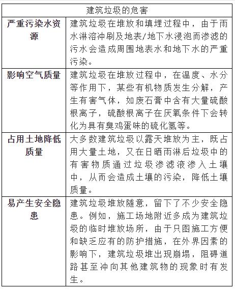 我國絕大部分建筑垃圾未經(jīng)任何處理便被運往郊外露天堆放或填埋,既占用大量土地,又容易在清運和堆放過程中的遺撒粉塵、灰砂飛揚等問題,進而造成嚴重的環(huán)境污染。