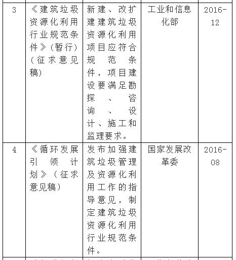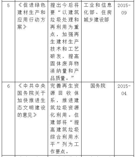 長期以來,由于缺乏統(tǒng)一完善的建筑垃圾管理辦法和良好的產(chǎn)業(yè)扶持政策致使建筑垃圾絕大部分未經(jīng)任何處理便被露天堆放或簡易填埋,如何處理和利用建筑垃圾,已經(jīng)成為政府所面臨的一個重要難題。為了解決建筑垃圾處理難題,促進建筑垃圾循環(huán)利用,國家近幾年頒布了一系列的政策法規(guī),具體政策如下: