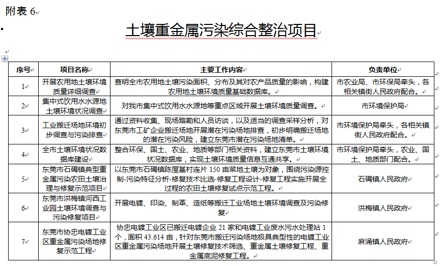 開展東莞市土壤污染調(diào)查、搬遷工業(yè)廢棄地重金屬污染修復(fù)技術(shù)集成與工程示范、典型農(nóng)田重金屬污染綜合防治技術(shù)工程示范等項(xiàng)目。開展涉重金屬企業(yè)污染防治技術(shù)示范項(xiàng)目16項(xiàng),具體名單見附表5。土壤重金屬污染綜合整治項(xiàng)目7項(xiàng),具體見附表6。