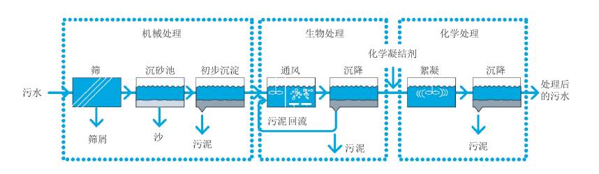 在20世紀60年代至70年代,瑞典修建了更多現代化的污水處理廠之后,極大地減少了磷和有機物的排放量。近十年來,磷和生化需氧量的處理水平保持在95%左右。另一方面,自2010年起,瑞典的平均氮凈化水平一直維持在60%左右(瑞典環(huán)保署,2014)。從20世紀80年代中期開始,增加了一些新的凈化方法,確實大幅提高了較大污水處理廠向氮敏感受體排放的氮的凈化水平。污水處理廠的處理過程如圖。