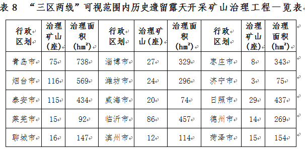 部署開(kāi)展“三區(qū)兩線”可視范圍內(nèi)歷史遺留露天開(kāi)采礦山地質(zhì)環(huán)境治理工程,到2020年治理歷史遺留露天開(kāi)采礦山577座,治理面積0.45萬(wàn)公頃,主要分布于青島、煙臺(tái)、泰安、日照、臨沂等地(表8)。