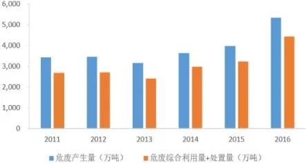 近年來(lái)危廢產(chǎn)量逐年上升,雖然危廢處置規(guī)模也在擴(kuò)大,但供需缺口要遠(yuǎn)比數(shù)據(jù)顯示的嚴(yán)峻。根據(jù)國(guó)家統(tǒng)計(jì)局?jǐn)?shù)據(jù),2016年我國(guó)共產(chǎn)生危險(xiǎn)廢物5347萬(wàn)噸,較上年同期增長(zhǎng)34.49%;但2016年危廢處置缺口達(dá)到917萬(wàn)噸,由于危廢產(chǎn)生量是通過企業(yè)申報(bào)數(shù)據(jù)統(tǒng)計(jì)的,往往較實(shí)際情況要低的多。此外,由于危廢處置實(shí)際產(chǎn)能也要低于經(jīng)營(yíng)許可證產(chǎn)能,危廢處置實(shí)際缺口要遠(yuǎn)高于統(tǒng)計(jì)水準(zhǔn)。