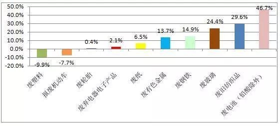 廢電池、廢玻璃、廢舊紡織品回收量增幅較為明顯,分別增長46.7%、24.4%和29.6%;廢塑料和報廢機(jī)動車回收量出現(xiàn)下滑,分別同比減少9.9%和7.7%。