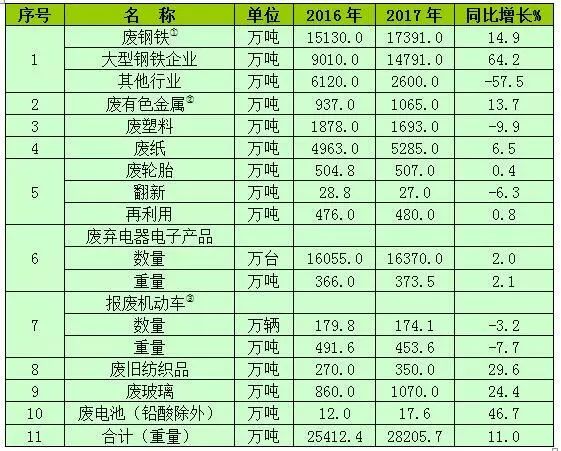 2017年我國這十大類別的再生資源回收總量為2.82億噸,同比增長11%。但不同類別的狀況不同。
