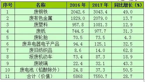 2017年,我國十大品種再生資源回收總值為7550.7億元,同比增長28.7%其中,廢舊紡織品增幅最高,同比增長62.8%;廢輪胎增幅相對最小,同比增長4.3%。