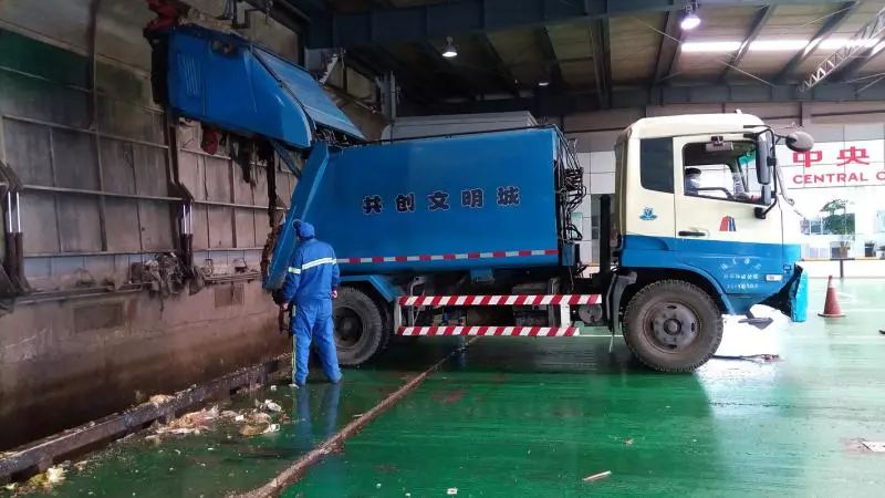⑦一路顛簸后,干垃圾車(chē)來(lái)到生活固廢集裝轉(zhuǎn)運(yùn)徐浦基地,將垃圾倒入“打包槽”