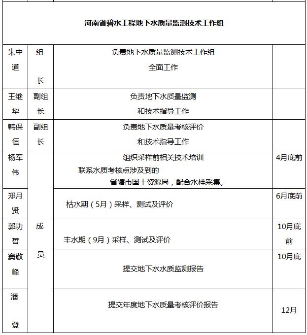 成立河南省碧水工程地下水質(zhì)量監(jiān)測技術(shù)工作組,由河南省地質(zhì)環(huán)境監(jiān)測院副院長朱中道任組長,總工程師王繼華、實驗測試中心主任韓保恒任副組長,工作組成員:楊軍偉、鄭月賢、郭功哲、竇敬峰、潘登等。部門負責牽頭,具體工作由河南省地質(zhì)環(huán)境監(jiān)測院承擔,省轄市國土資源局從事地質(zhì)環(huán)境監(jiān)測工作的負責人參與配合。