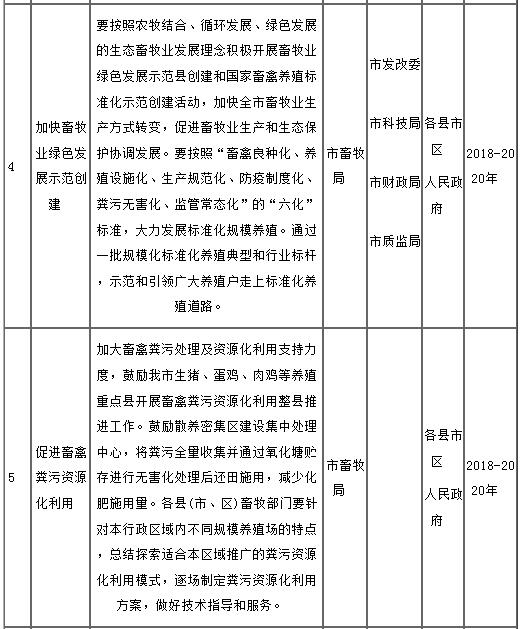 (二)工作目標(biāo)。到2020年,基本解決畜禽糞污處理和資源化利用問題,構(gòu)建種養(yǎng)循環(huán)發(fā)展機制,全市畜禽糞污綜合利用率達(dá)到75%以上,規(guī)模養(yǎng)殖場糞污處理設(shè)施裝備配套率達(dá)到95%以上,大型規(guī)模養(yǎng)殖場糞污處理設(shè)施裝備配套率提前一年達(dá)到100%。申報省級畜牧業(yè)綠色發(fā)展示范縣的縣市區(qū)及國家級畜禽標(biāo)準(zhǔn)化示范企業(yè)率先實現(xiàn)上述目標(biāo)。