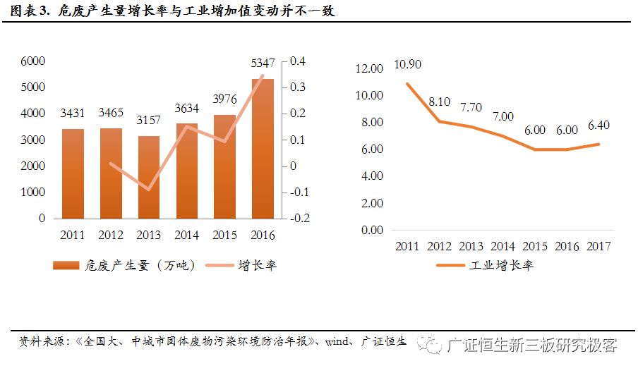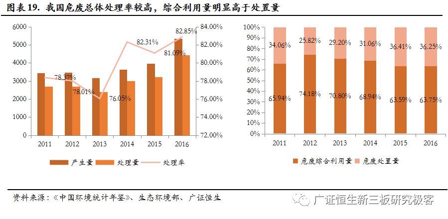 一是環(huán)保統(tǒng)計口徑的變化,可以看到,危廢產(chǎn)生量在2011年和2016兩次快速增長,2011年的增長是因為統(tǒng)計量從10kg下降到了1kg,2016年是擴大了危廢的種類,從400種擴大到了479種。