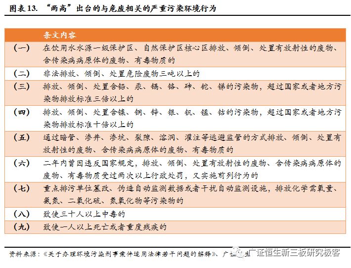 根據(jù)2016年12月,“兩高”出臺的關(guān)于《關(guān)于辦理環(huán)境污染刑事案件適用法律若干問題的解釋》,涉及入刑的條款,大部分與危廢直接相關(guān),在認(rèn)定為“嚴(yán)重污染環(huán)境”的18個行為中,9條與危廢直接相關(guān)。