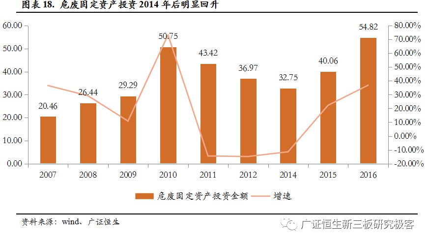 對危廢巨大的處理需求促使我國危廢方面的投入持續(xù)增加,尤其是在2014年之后,出現(xiàn)了明顯的回升。