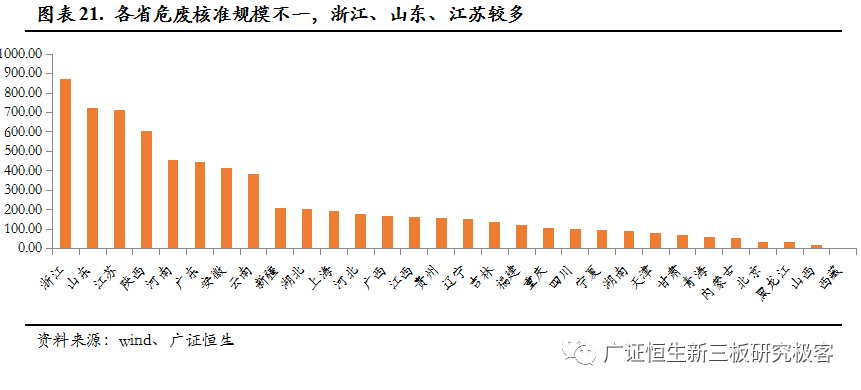 從核準(zhǔn)規(guī)模來看,危廢核準(zhǔn)規(guī)模為6471萬噸,其中資源化占比在70%以上,近幾年增速變慢,從各省來看,危廢的產(chǎn)生量與核準(zhǔn)量基本匹配,核準(zhǔn)數(shù)量較多的是浙江、山東及江蘇。