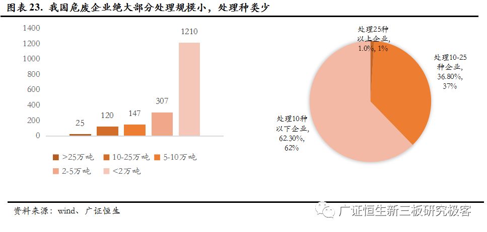 (1) 技術(shù)壁壘高。危廢品類眾多,不同產(chǎn)品處理方式區(qū)別很大,我國危廢企業(yè)都偏小,無法完成技術(shù)積累以獲得更多資質(zhì)。