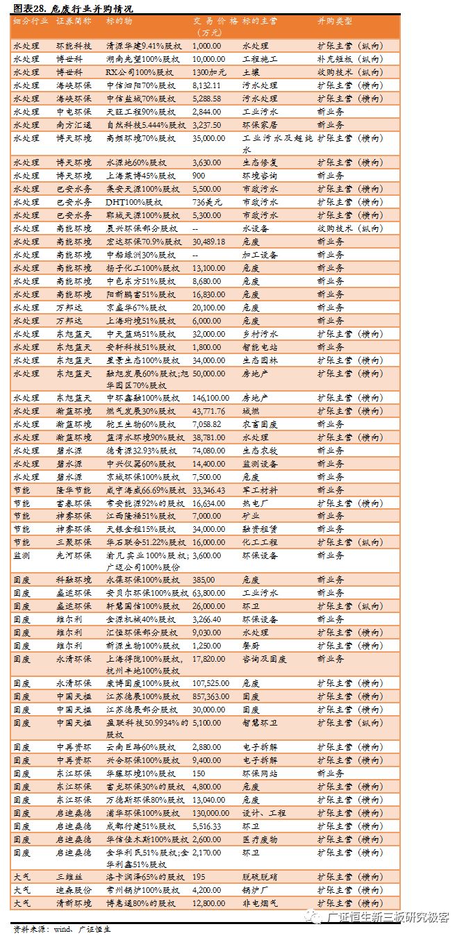 進軍新業(yè)務(wù)的案例有24家,方向為危廢、工業(yè)環(huán)保以及環(huán)保設(shè)備,其中危廢高達9家,工業(yè)污水2家,設(shè)備4家,為并購的主要方向,這也與危廢跟工業(yè)環(huán)保有比較高的技術(shù)壁壘相關(guān)。