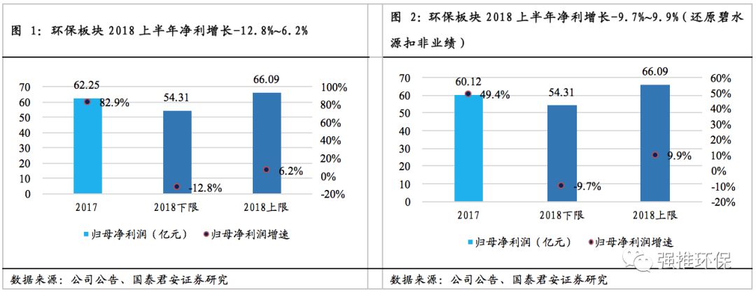 我們統(tǒng)計環(huán)保板塊2018年中報業(yè)績披露情況,截至2018年7月14日,板塊共有45家上市公司披露業(yè)績預(yù)告,其中36家為最新披露,其余9家為4月份年報時披露。根據(jù)業(yè)績預(yù)告的區(qū)間統(tǒng)計,該45家上市公司的歸母凈利潤下限合計54.31億元、上限合計66.09億元,相對2017年同期的62.25億元,增速在-12.8%~6.2%之間??紤]到板塊龍頭公司碧水源上年同期公司較大的投資收益造成非經(jīng)常性損益,將碧水源的業(yè)績修正為扣非業(yè)績后,板塊增速在-9.7%~9.9%之間。相對于上年同期49.4%(剔除2016未披露中報的新股)的增速,下滑幅度較為明顯。