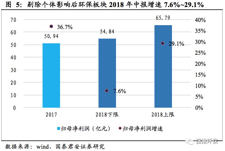 從公司層面來看,環(huán)保板塊2018年中報增速大幅下滑,主要是受神霧環(huán)保、神霧節(jié)能、盛運環(huán)保等由于公司個體經(jīng)營影響的拖累,將這些公司剔除后,環(huán)保板塊2018年上半年凈利潤的區(qū)間合計在54.84 ~65.79之間,同比增長7.6%~29.1%,雖然較上年同期的36.7%增速有所下滑,但仍保持較為穩(wěn)定的增長態(tài)勢。