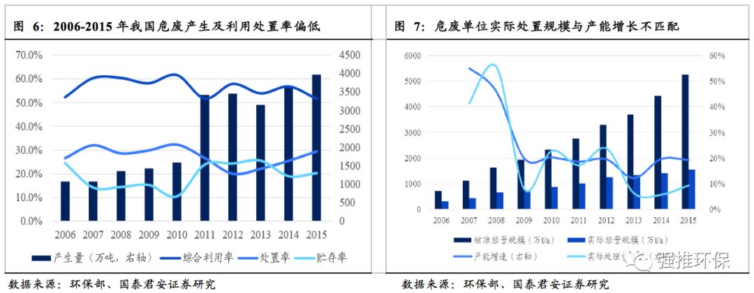 現(xiàn)有危廢資質(zhì)中,產(chǎn)能兌現(xiàn)比例低。2015年我國已核準(zhǔn)危廢處置產(chǎn)能總量5263萬噸,其中無害化982萬噸。按照2015年約1億噸危廢產(chǎn)量核算,產(chǎn)能缺口約為50%,而實際綜合利用+處置率約25%。其中顯著的差距主要來源于兩方面: