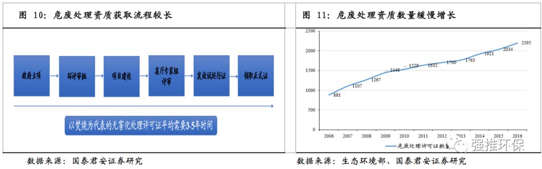 有進入壁壘,有技術(shù)或管理優(yōu)勢。危廢處理行業(yè)管理采用許可證制度,沒有獲得許可證的企業(yè)不得進行危廢處理。許可證的獲取需要經(jīng)過政府立項、環(huán)評審批、項目建設(shè)、省廳專家組評審、發(fā)放試生產(chǎn)證、領(lǐng)取正式證,以焚燒為代表的無害化處理許可證平均需要3~5時間。根據(jù)環(huán)保部2017年12月發(fā)布的《2017年全國大、中城市固體廢物污染環(huán)境防治年報》數(shù)據(jù),截至2016年底,全國共頒發(fā)危險廢物經(jīng)營許可證2195份,較2015年增加131份,增速6%,資質(zhì)增速緩慢。