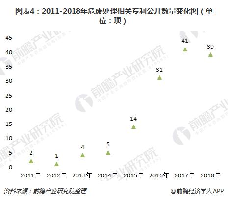在公開專利數(shù)量方面,2011-2017年,我國危廢處理專利公開數(shù)量總體上呈趨勢。2017年,我國危廢處理專利公開數(shù)量為41項,達到近年來最大值;截至2018年7月,專利公開數(shù)量為39項。