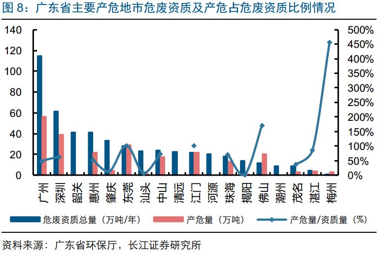梅州/佛山/東莞/江門危廢產(chǎn)生量大于危廢資質(zhì)量(比例分別為457%、171%、102%、101%),危廢處置產(chǎn)能供給相對(duì)緊張;