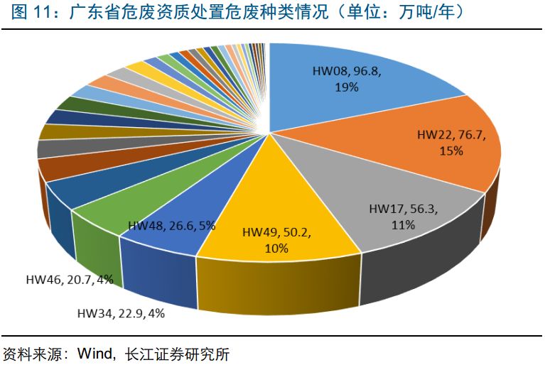 廣東省危廢種類中前5位的HW08(含油污泥,96.8萬噸,占總資質(zhì)的20%)/HW22(含銅廢物,76.7萬噸,占總資質(zhì)的15%)/HW17(表面處理污泥,56.3萬噸,占總資質(zhì)的11%)/HW49(其他廢物,50.2萬噸,占總資質(zhì)的10%)/HW48(有色金屬冶煉廢物,26.6萬噸,占總資質(zhì)的5%)合計(jì)占總資質(zhì)61%,危廢資質(zhì)種類集中度高。