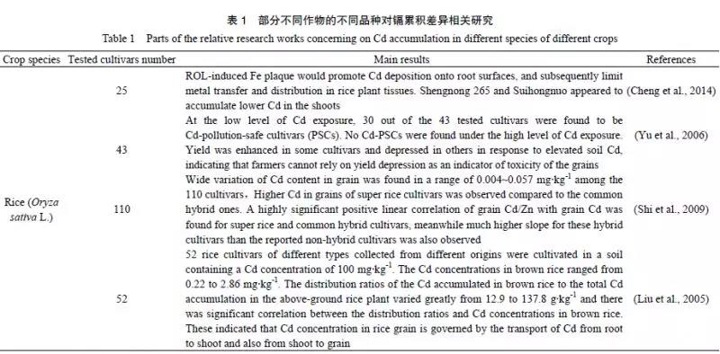 不同作物種類對(duì)鎘的累積量有所差異,例如鎘污染土壤中豆類作物(豆科Leguminosae)鎘累積量較低,根菜類蔬菜(傘形科Umbelliferae和百合科Liliaceae)鎘累積量居中,而葉類蔬菜(菊科Asteraceae和藜科Chenopodiaceae)鎘累積量相對(duì)較高。而同種作物的不同品種(基因型)的鎘吸收累積也存在差異,已有研究表明,水稻(Oryza sativa L.)、大麥(Hordeum vulgare L.)、玉米(Zea maysL.)、小麥、胡蘿卜(Daucus carota L.)、大白菜、豌豆(Pisum sativum L.)、土豆(Solanum tuberosum L.)、花生(Arachis hypogaea L.)及空心菜(Ipomoea aquatica Forsk.)等農(nóng)作物的不同品種鎘吸收累積量差異較大。表1 列舉了部分有關(guān)不同種類作物的基因型差異對(duì)鎘吸收累積的研究及相關(guān)結(jié)論,已有的研究均表明篩選低累積作物對(duì)于中低濃度鎘污染土壤的安全利用具有可行性。