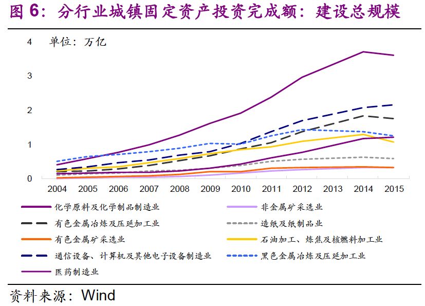 我們也關(guān)注到主要行業(yè)規(guī)模擴(kuò)張倍數(shù)大于危廢產(chǎn)量擴(kuò)張倍數(shù)。從2004年到2015年,化學(xué)原料及化學(xué)制品制造業(yè)、非金屬礦采選業(yè)、有色金屬冶煉及壓延加工業(yè)、有色金屬礦采選業(yè)、石油加工、煉焦及核燃料加工業(yè)、醫(yī)藥制造業(yè)的城鎮(zhèn)固定資產(chǎn)投資完成額——建設(shè)總規(guī)模分別是2004年的9 、26 、9 、13 、5 、9 倍,我國(guó)工業(yè)體系得到長(zhǎng)足發(fā)展。同期,各行業(yè)危廢產(chǎn)量分別是原來(lái)的2 、9 、12、1、3 、4 倍,總體小于建設(shè)總規(guī)模擴(kuò)張倍數(shù)。