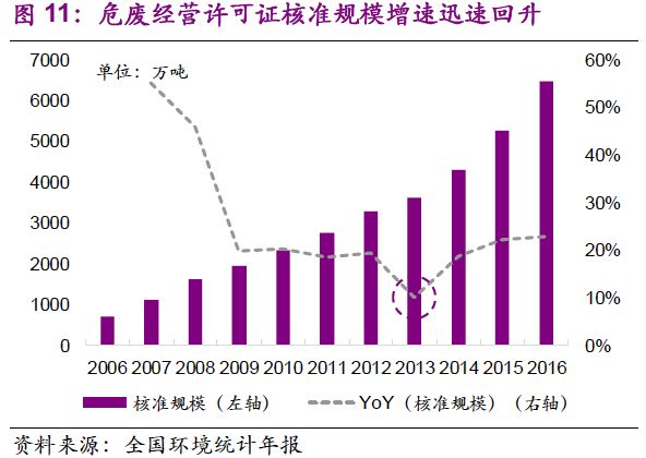 危廢經(jīng)營(yíng)許可規(guī)模的增加速度與需求釋放速度相當(dāng)。值得注意的是,2013-2016年,全國(guó)危廢產(chǎn)量年均復(fù)合增速19%,危廢許可經(jīng)營(yíng)規(guī)模年均復(fù)合增速21%。截止2016年底,總核準(zhǔn)發(fā)放規(guī)模已達(dá)到6471萬(wàn)噸。