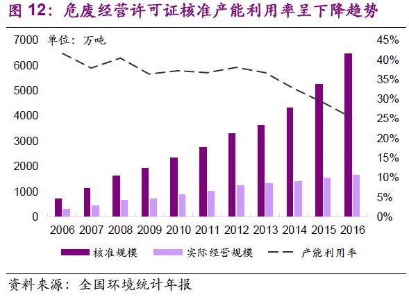 環(huán)保壓力下需求雙層疊加,產(chǎn)能釋放速度有望加快。危廢產(chǎn)業(yè)供需解構(gòu)——需求側(cè):危險(xiǎn)廢物處置需求增加的背后,是我國(guó)工業(yè)規(guī)模和產(chǎn)品產(chǎn)量的增長(zhǎng)。危廢產(chǎn)量與工業(yè)增加值高度相關(guān)(相關(guān)系數(shù)0.91),且具有較強(qiáng)的行業(yè)結(jié)構(gòu)性。同時(shí)行業(yè)隱性需求的釋放對(duì)環(huán)保壓力較為依賴。供給側(cè):面對(duì)需求釋放,危廢許可經(jīng)營(yíng)發(fā)放規(guī)模表現(xiàn)出較大彈性(2013-2016年CAGR達(dá)21%),但實(shí)際經(jīng)營(yíng)規(guī)模增速有限,由此造成產(chǎn)能利用率進(jìn)一步下降(2013-2016年由37%降至25%)。當(dāng)前,“環(huán)保督察”推動(dòng)隱性需求釋放、倒逼產(chǎn)業(yè)治理:“歷史存量+當(dāng)期增量”雙層疊加推動(dòng)“量”的提升,供需不平衡導(dǎo)致區(qū)域“價(jià)”的提升,預(yù)計(jì)未來(lái)2-3年行業(yè)產(chǎn)能釋放速度將加快。