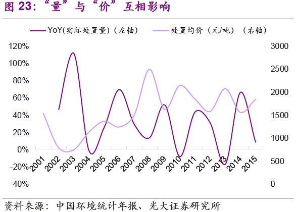 量:處置量提高的驅(qū)動(dòng)因素已經(jīng)由工業(yè)發(fā)展轉(zhuǎn)變?yōu)榄h(huán)保執(zhí)法。我們認(rèn)為,2001-2008年,實(shí)際處置量迅速增長(zhǎng)的驅(qū)動(dòng)力在于國(guó)內(nèi)工業(yè)迅速發(fā)展帶動(dòng)的自然需求,以及“危廢申報(bào)制度”、“企業(yè)臺(tái)帳制度”等基本制度建立下的規(guī)范化作用;而2011年至今,在工業(yè)體系逐漸成熟的背景下,實(shí)際處置量增長(zhǎng)的主要驅(qū)動(dòng)力來(lái)自環(huán)保執(zhí)法的強(qiáng)化。