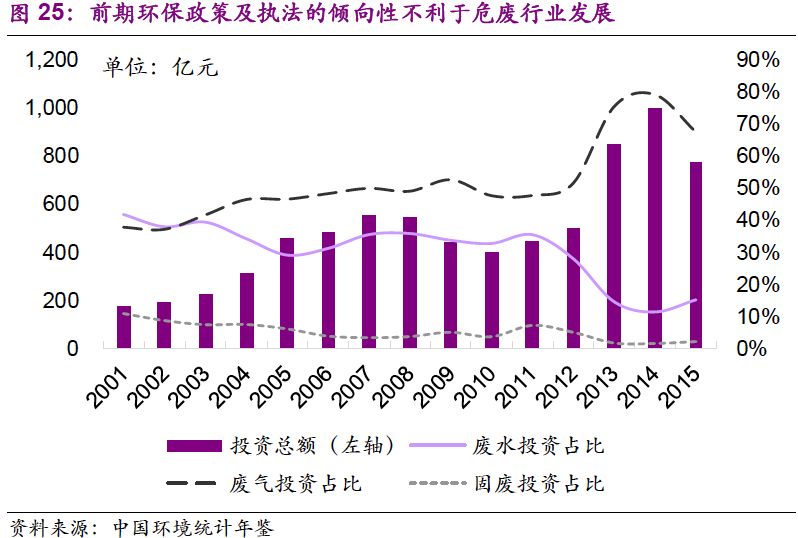 (1)前期環(huán)保政策及執(zhí)法的傾向性不利于危廢行業(yè)發(fā)展。污染的負(fù)外部性決定了環(huán)保行業(yè)規(guī)模主要受需求影響,而需求的釋放來(lái)自于政策所指向的環(huán)保壓力。2010年以后,我國(guó)的大氣污染是突出的環(huán)境問(wèn)題,環(huán)保政策和執(zhí)法在一段時(shí)間內(nèi)更傾向于此,且采取突擊式的措施進(jìn)行治理;而對(duì)其他類型的環(huán)境治理并未采取過(guò)于急迫的措施,環(huán)保壓力不足導(dǎo)致危廢處置行業(yè)發(fā)展緩慢和隱性排污情況較為普遍。在投資方面, 2014年,在工業(yè)污染源治理投資中,廢氣和固廢領(lǐng)域占比分別為79.1%和1.5%,工業(yè)固廢投資比例一直較低。